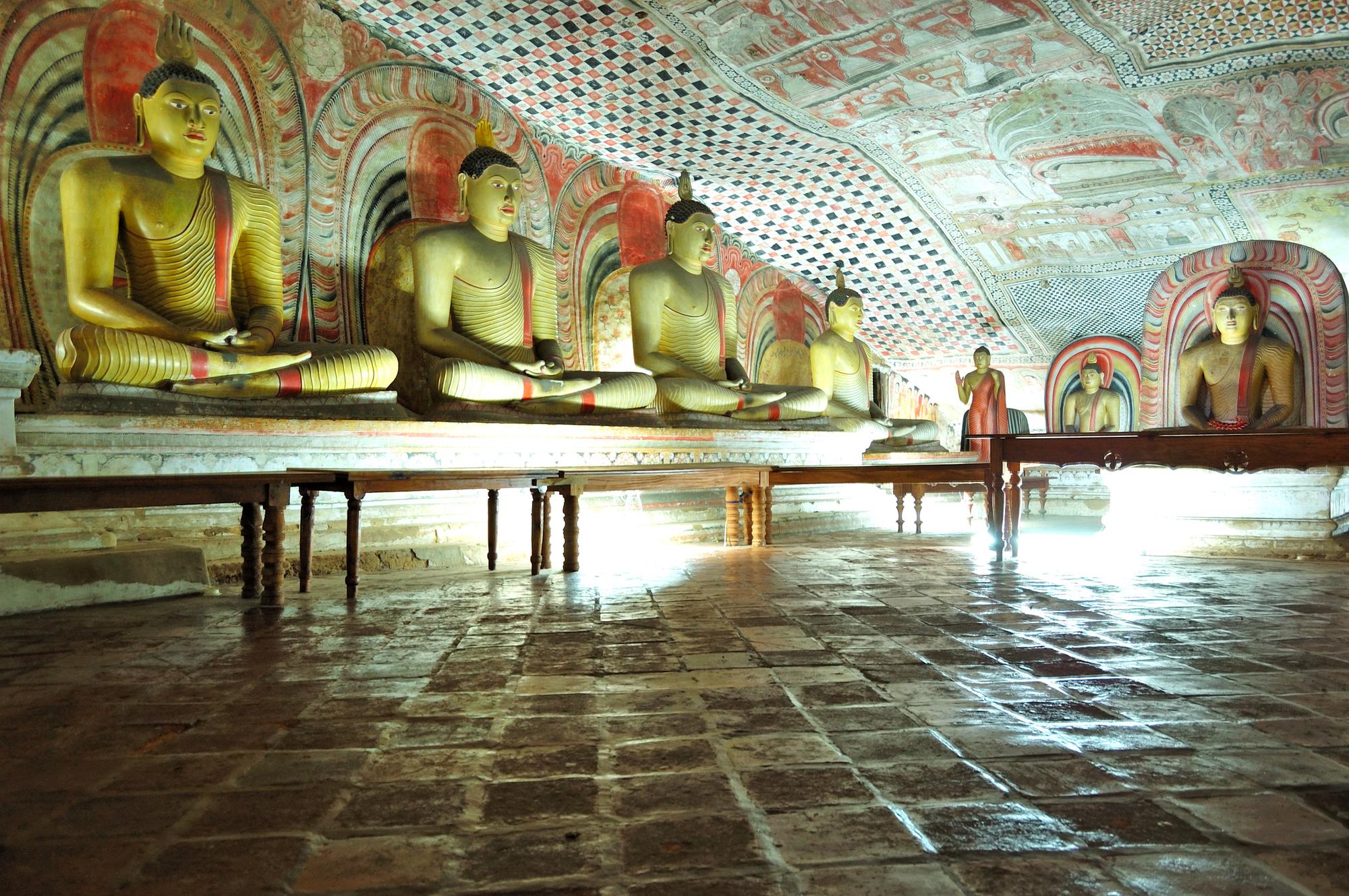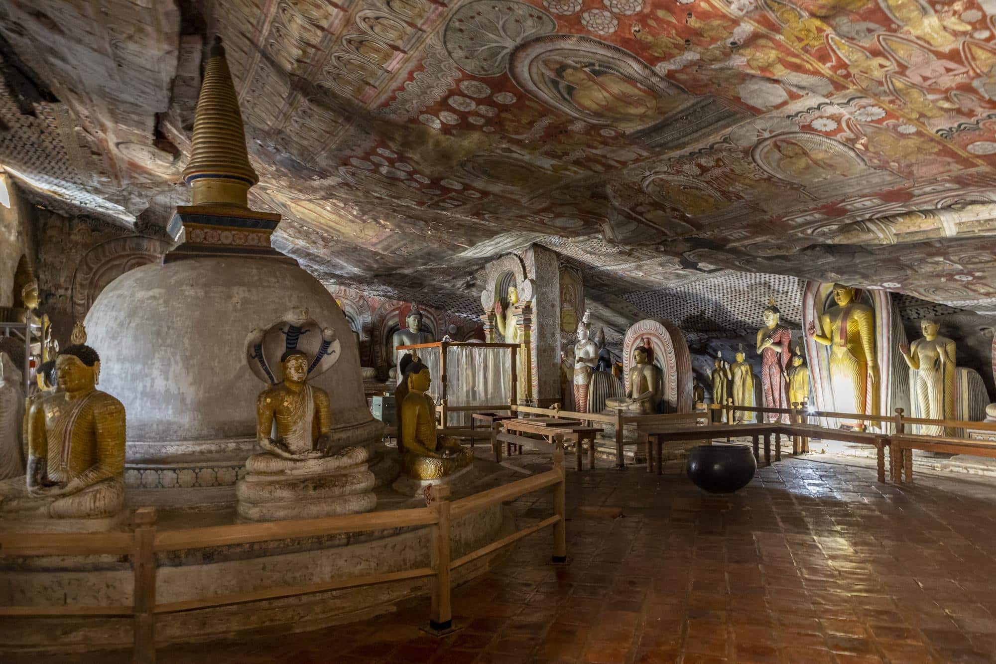A stupa surrounded by eleven statues of the seated Buddha can also be found in this cave. Thereby highlighting the close association between the two religions and they are statues of the Hindu Gods Saman, Upulvan, Maithree, and Natha. The rock walls of the cave are adorned with murals detailing early Buddhist historical events. These murals are in a good state of preservation.