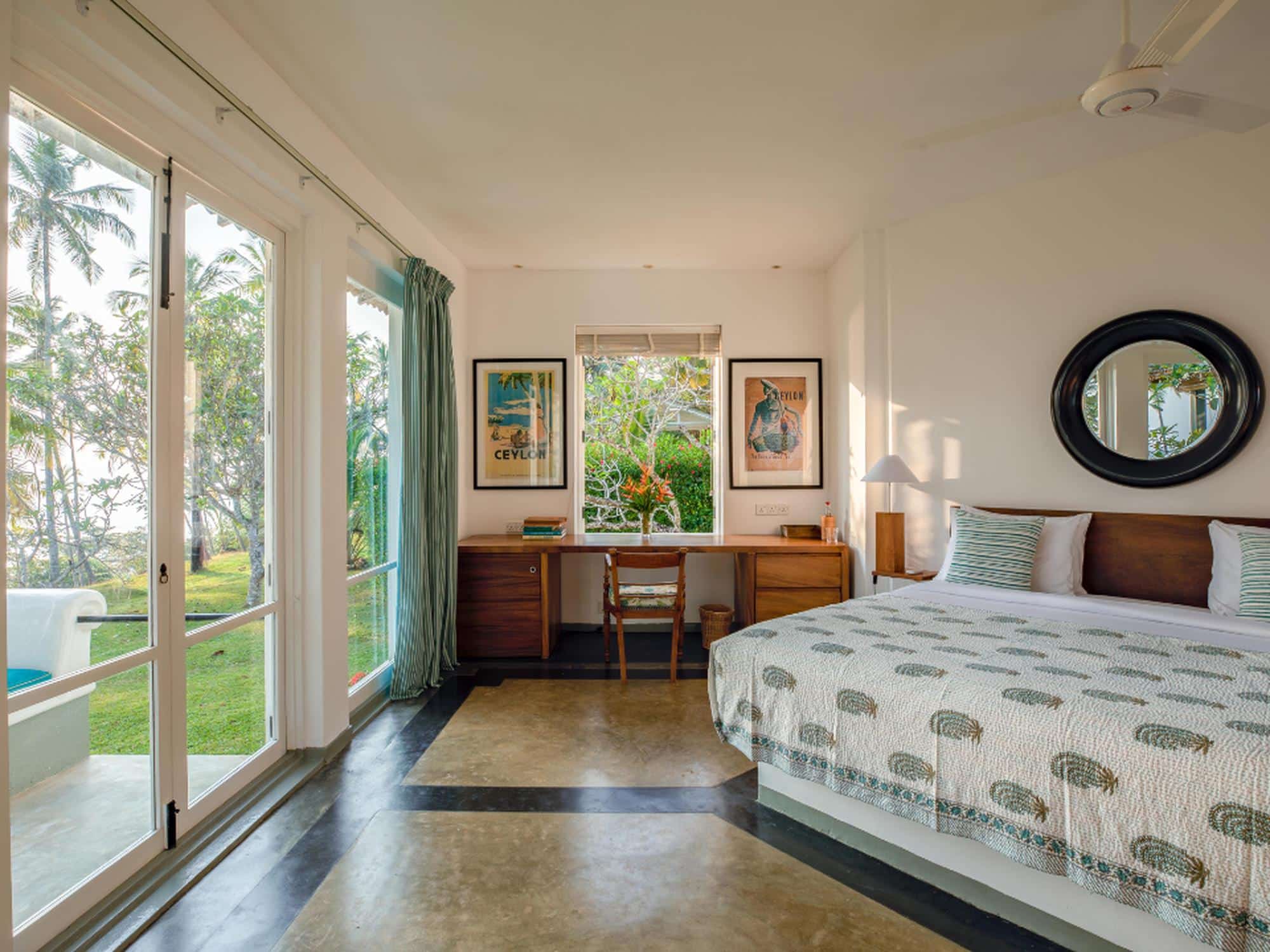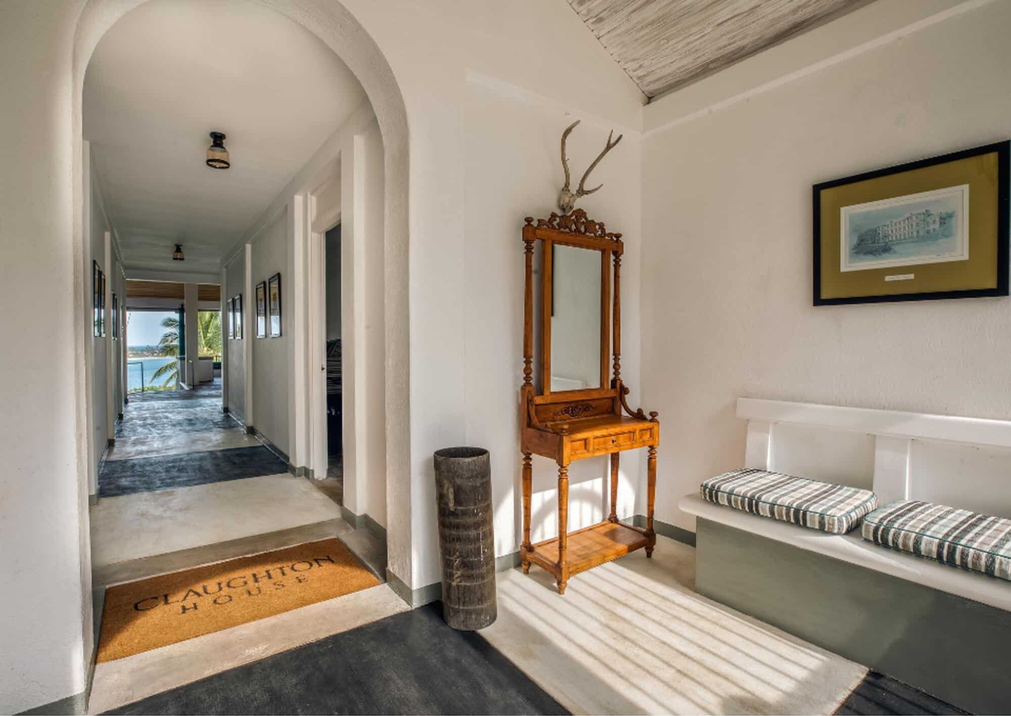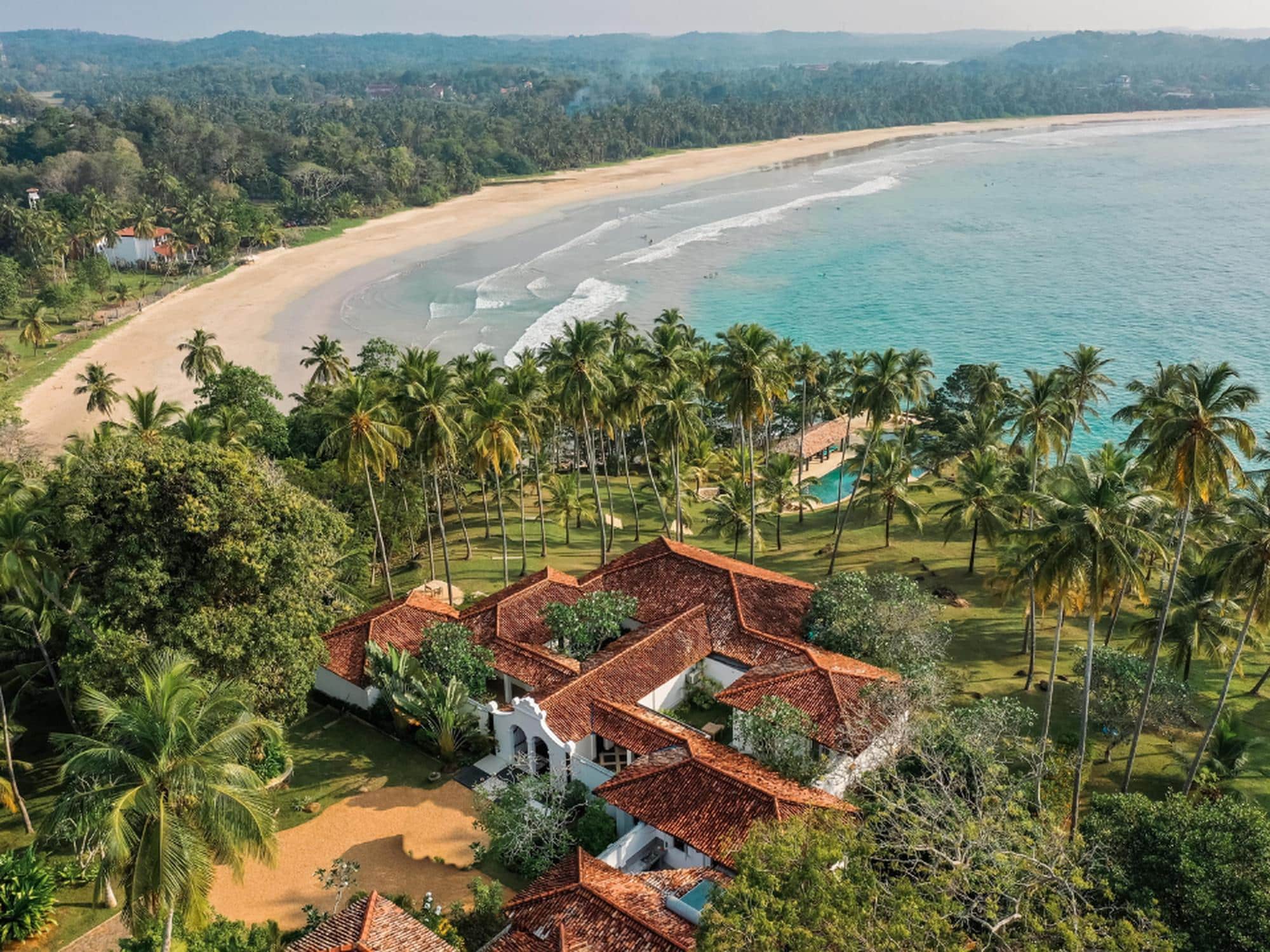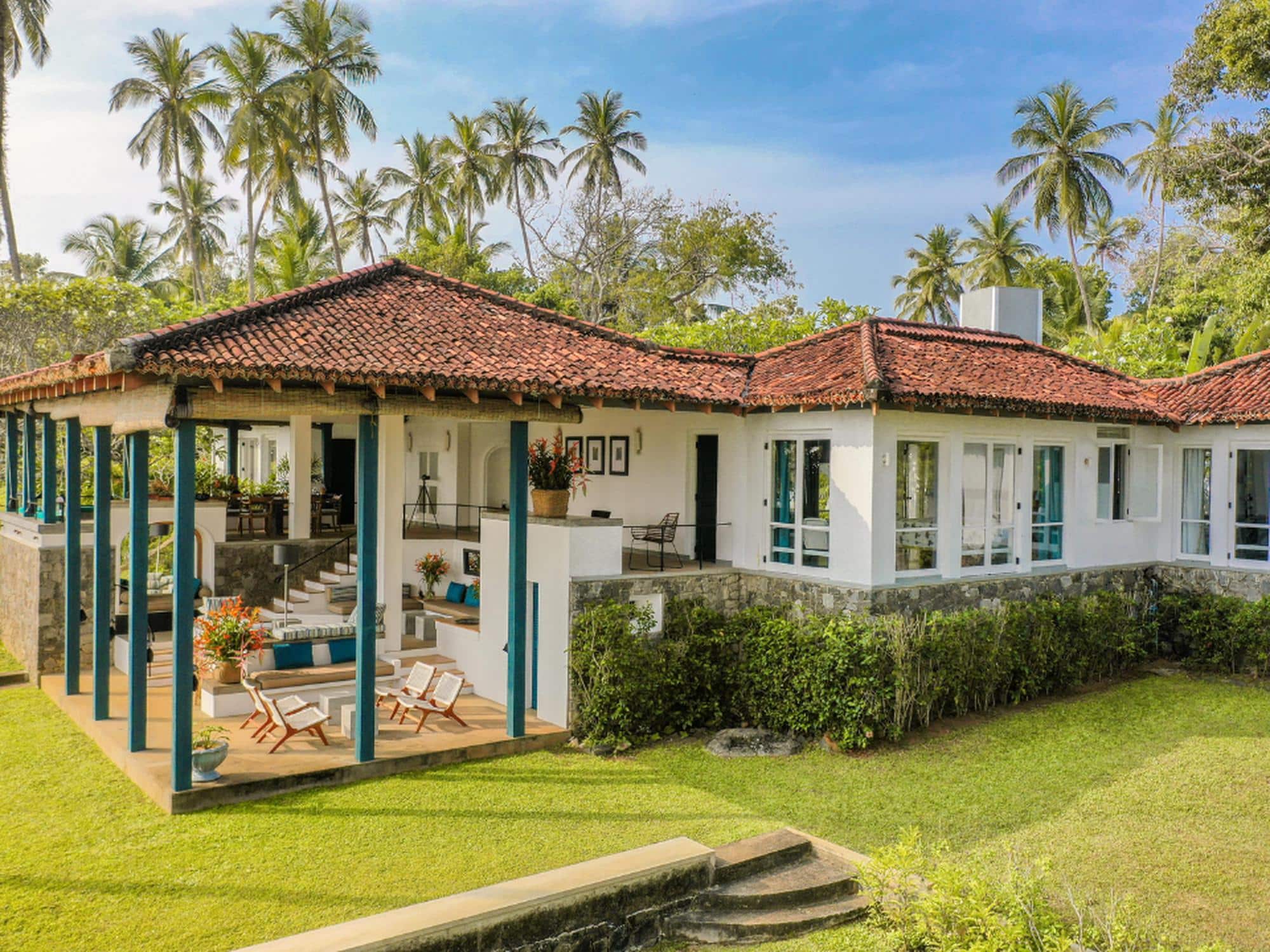 Perched on a hilltop amidst 8 acres of walled-in gardens Claughton House Dickwella, designed by Geoffrey Bawa, is an example of intelligent architecture. Entering the house your vision is channeled towards the views across the treetops and out to sea. From the dining table, you are drawn down the slope towards the huge pool that has an infinity edge to merge with the ocean. A poolside pavilion and BBQ will ensure most of the day is spent here but you could venture down some steps to the private gate and onto the beach for seasonally safe swimming and surfing.
